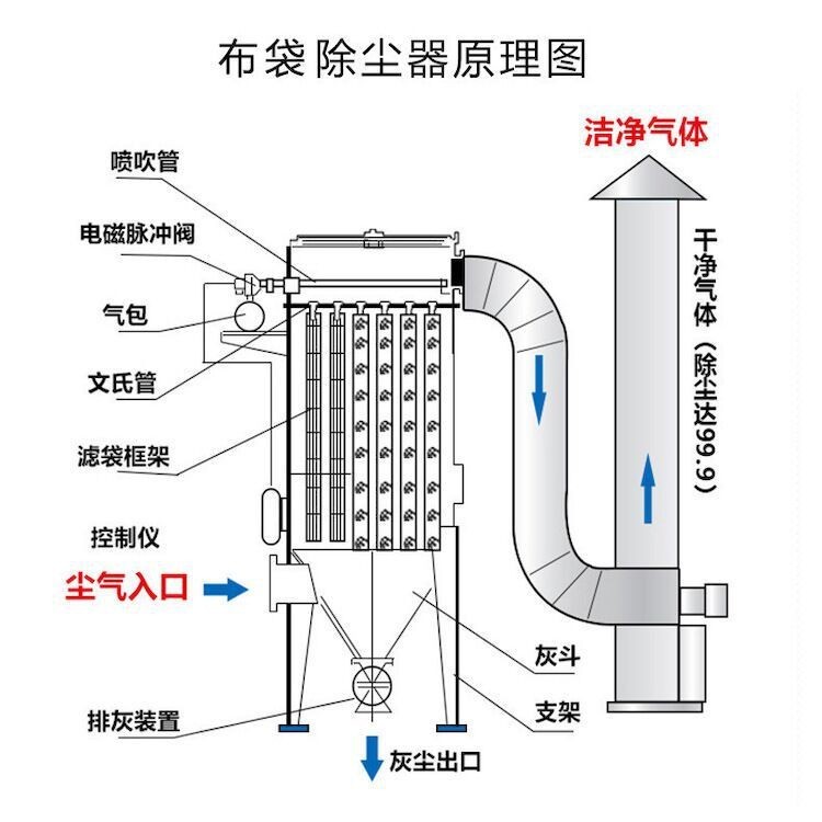 布袋除塵器的原理,空氣經過進氣口進入除塵器,在袋內部分別與布袋外表面上的灰塵或顆粒物相遇,被隔離在濾袋外表面形成灰層。清潔空氣則沿袋內間隙向上流出,排放至大氣中。當灰層太厚時,需要對布袋進行清灰處理,提高其使用壽命和效率。