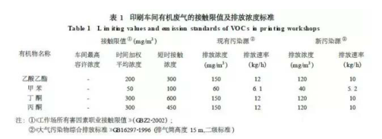目前在我國的包裝塑料基材等印刷過程中大量使用的溶劑型油墨,含有50%~60%的揮發(fā)性組分,如果加上調(diào)油墨粘度所需的稀釋劑,那么在印品干燥時,揮發(fā)性組分的總含量為70%~80%。這些有機溶劑所揮發(fā)的氣體,通過呼吸進(jìn)入人體內(nèi),對人體的肝臟和神經(jīng)系統(tǒng)造成損害;有機化合物排放到大氣中,與氮氧化物反應(yīng),發(fā)生光化學(xué)反應(yīng),形成光化學(xué)氧化劑而毀壞森林與破壞生態(tài)環(huán)境。一些_制定了“勞動衛(wèi)生法”、“有機溶劑排放法”等一系列法規(guī)。我國在各種印刷過程及傳統(tǒng)耗材中存在VOCs排放造成污染問題,例如在包裝印刷廠的主要產(chǎn)品為各種塑料薄膜的印刷制品,在生產(chǎn)中大量使用彩色油墨和有機稀料,油墨用的稀料(溶劑)主要是甲苯、乙酸乙酯、丙酮及少量丁酮。這些溶劑在產(chǎn)品生產(chǎn)過程中變?yōu)?/font>VOCs廢氣大量排出。因此,對包裝印刷廠生產(chǎn)車間排出的VOCs廢氣_采取有效的收集方法和凈化工藝進(jìn)行處理。在我國的工作場所有害因素職業(yè)接觸限值和排放標(biāo)準(zhǔn)中,對VOCs廢氣的排放作了嚴(yán)格的規(guī)定,如表1所示。如果在印刷車間安裝合理的廢氣收集系統(tǒng)和溶劑回收裝置,可以達(dá)到降低VOCs揮發(fā)量和減少污染的目的;同時可以回收溶劑資源,這點已經(jīng)被實踐證明。